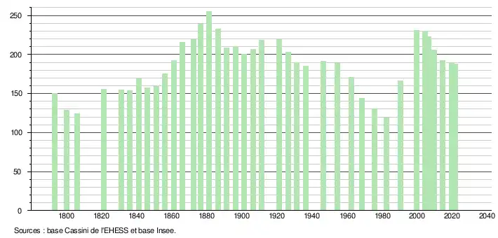 L'évolution du nombre d'habitants est connue à travers les recensements de la population effectués dans la commune depuis 1793. Pour les communes de moins de 10 000 habitants, une enquête de recensement portant sur toute la population est réalisée tous les cinq ans, les populations légales des années intermédiaires étant quant à elles estimées par interpolation ou extrapolation[32]. Pour la commune, le premier recensement exhaustif entrant dans le cadre du nouveau dispositif a été réalisé en 2004[33].