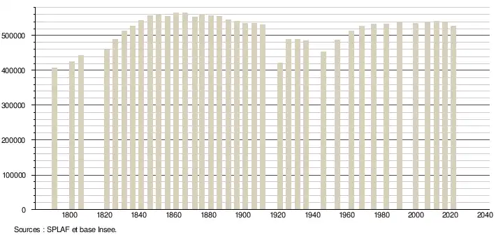 (Sources : SPLAF - population totale du département depuis sa création jusqu'en 1962[5] − puis base Insee − population sans doubles comptes de 1968 à 2006[6] puis population municipale à partir de 2006[7].)