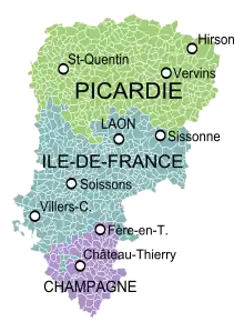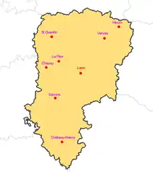 Villes principales : Laon (préfecture), Saint-Quentin, Soissons, Château-Thierry, Tergnier, Chauny, Hirson, Villers-Cotterêts, La Fère, Vervins et Guise.