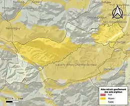 Le retrait-gonflement des sols argileux est susceptible d'engendrer des dommages importants aux bâtiments en cas d’alternance de périodes de sécheresse et de pluie[53]. 61,1 % de la superficie communale est en aléa moyen ou fort (59 % au niveau départemental et 48,5 % au niveau national)[Carte 6]. Depuis le , en application de la loi ELAN, différentes contraintes s'imposent aux vendeurs, maîtres d'ouvrages ou constructeurs de biens situés dans une zone classée en aléa moyen ou fort[Note 8],[54].