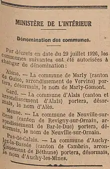 - « Ministère de l'Intérieur - Dénominations des communes », Journal officiel de la République française, no 184 de la 58e année, , p. 8989 (lire en ligne