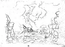 « On ne peut s'empêcher de dire ici un mot de la tempête de cet Opéra, tant vantée par tout les Connoisseurs, & qui fait un effet si prodigieux. Marais imagina de faire exécuter la basse de la tempête, non seulement sur les Bassons & les Basses de Violons à l'ordinaire, mais encore sur des Tambours peu tendus[11], qui roulant continuellement, formant un bruit sourd & lugubre lequel joint a des tons aigus & perçans pris sur le haut de la chanterelle des Violons et les Haut-bois font sentir ensemble toute la fureur & tout l'horreur d'une mer agitée [...] »