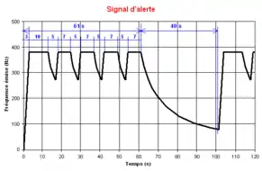 Il existe plusieurs signaux émis par les sirènes définis par un arrêté[12]. Le signal national d’alerte consiste en trois cycles successifs d'une durée d'1 minute et 41 secondes chacun et séparés par un intervalle de 5 secondes et d'un son modulé en fréquence :