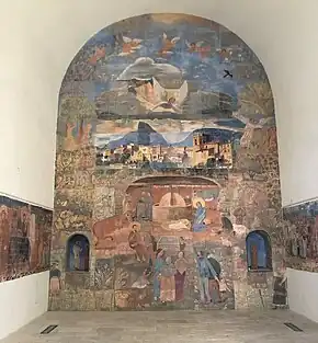 - Dans les Alpes Maritimes, à La Gaude, c’est en juillet 2003 qu’est inaugurée la rénovation artistique de la chapelle Saint-Ange[9] dont Obolensky a réalisé les fresques intérieures sur le cycle de la Nativité[10] ; la naissance de l’enfant Jésus est située fictivement dans ce village provençal, à proximité d’un moulin à huile et parmi les cultures traditionnelles d’œillets, d’orangers et d’oliviers, tandis que se déploie au-dessus du nouveau-né le paysage même de La Gaude[8]. Sont également représentés l’arrivée des Rois mages, le Baptême du Christ, la Résurrection, les quatre évangélistes et deux anges[11].