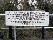 Plaque à la base de l'arbre de Noël de Trafalgar Square (2008).