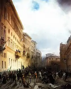 Ayant rejeté la proposition autrichienne d'armistice, Carlo Alberto se retire vers Milan, où il combat à nouveau les Autrichiens le 4 août 1848 et perd à nouveau. Il se replie alors avec son armée sur les remparts de la ville où la population lui manifeste son hostilité, ayant deviné qu'il voulait abandonner la place aux Autrichiens. Après avoir finalement accepté l'armistice, le roi est apparu sur le balcon du Palazzo Greppi pour calmer la population, mais une balle l'a frôlé et il a dû battre en retraite immédiatement.