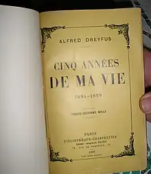 - Alfred Dreyfus, Cinq années de ma vie, Paris, Fasquelle, (en ligne : facsimile de la première édition, ebook sur Gutemberg).
