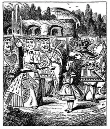Alice se retrouve dans les jardins du château, un véritable labyrinthe où des cartes à jouer peignent des rosiers blancs plantés par erreur en rouge, pensant ainsi échapper à la colère de la Reine qui a pour habitude de réclamer la tête de ses contradicteurs. Celle-ci survient alors, précédée par un défilé de cartes. Le Lapin blanc fait office de chambellan, présentant la Reine et le Roi de cœur. Après avoir condamné les jardiniers à être décapités, la Reine propose à Alice, dont l'apparence l'intrigue, une partie de croquet. Les arceaux sont des cartes, les maillets des flamants roses et les boules des hérissons. La partie est truquée par les objets qui craignent pour leur tête et, quand c'est au tour d'Alice de jouer, son flamant fait des siennes. Le Chat de Chester apparaît dans le dos de la Reine et s'arrange pour que le flamant qu'elle tient s'accroche dans ses jupes, provoquant sa chute et dévoilant ses dessous. Alors que, de rage, elle prend Alice pour la coupable et demande son exécution, le Roi obtient un procès pour la forme.