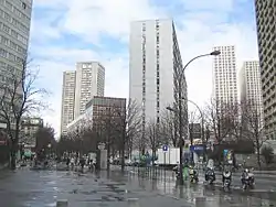 Enfin, les grands ensembles de l'après-guerre rejettent complètement l'alignement sur rue. Dans les nouveaux quartiers comme dans les projets de ville imaginés par Le Corbusier dans les années 1920, barres et tours sont alignées les unes par rapport aux autres selon une grille qui ignore la rue, simple voie de desserte. Le plan d'urbanisme directeur de 1967 encourage les promoteurs à construire les immeubles en retrait, où ils ont l'autorisation de construire plus haut qu'en bordure de la rue traditionnelle[réf. nécessaire].