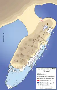 Le promontoire d’Aliki est un éperon de marbre exploité probablement dès le début de l'occupation de l'île, au VIIe siècle av. J.-C. L'exploitation du marbre y a été si intensive et prolongée dans le temps que toute l'extrémité sud de la presqu'île est arasée jusqu'au niveau de la mer, tandis que les flancs ouest et sud-ouest de la colline sont largement entamés. Au fur et à mesure de l'exploitation, les fronts de carrières ont ainsi progressé vers le nord et l'est, tandis que les déblais étaient rejetés vers le sommet.