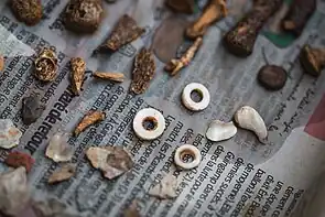 En tout, 11 éléments de parure ont été trouvés dans l’allée couverte en 2019, dont 9 sous le dallage : un fragment de coquillage, une dentale, une perle en calcaire, une pourpre (coquillage), une perle massive en calcaire, un fragment de perle à gorge en os, une perle en os ou en calcaire, une perle circulaire en os, un coquillage brisé, et peut-être une autre perle en coquillage, sans certitude.