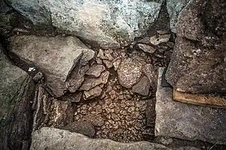 Enfin, le rempart dans lequel est enchâssé l’allée couverte, et qui été jusqu’à présent daté de la Protohistoire, remonte en réalité à l’époque médiévale, d’après une datation radiocarbone obtenue sur un fragment d’os long retrouvé dans le rempart. De plus, l’un des sondages effectués aux abords de l’allée couverte a montré la présence d’un bel appareil en pierres de taille, qui pourrait constituer la façade du rempart.
