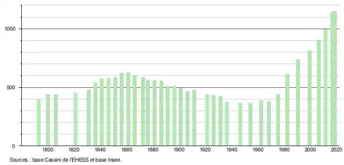 L'évolution du nombre d'habitants est connue à travers les recensements de la population effectués dans la commune depuis 1793. Pour les communes de moins de 10 000 habitants, une enquête de recensement portant sur toute la population est réalisée tous les cinq ans, les populations légales des années intermédiaires étant quant à elles estimées par interpolation ou extrapolation[24]. Pour la commune, le premier recensement exhaustif entrant dans le cadre du nouveau dispositif a été réalisé en 2006[25].