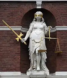 La Justice est représentée le plus souvent par une femme les yeux bandés tenant une balance, attributs symbolisant respectivement l’indifférence aux apparences et l'évaluation des arguments qui lui sont présentés. La Justice dont il est question ici est donc l'institution et celle qui se dégage du débat judiciaire ; aussi cette allégorie orne-t-elle en général les lieux qui lui sont consacrés. Elle s'oppose implicitement à d'autres notions de la justice courantes dans la même société (vertu cardinale ou vengeance, par exemple). Les yeux bandés se retrouvent dans une allégorie de la chance, aussi indifférente à la position sociale, la balance dans une allégorie du commerce.