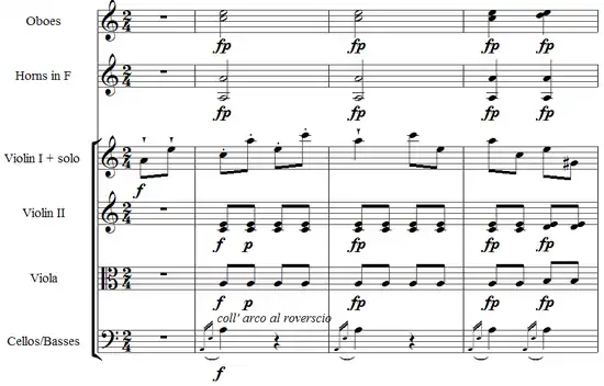 Les deux caractéristiques que nous venons de mentionner peuvent être observées dans l'extrait suivant de la musique turque dans le Concerto pour violon n° 5 de Mozart :