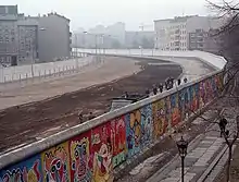Le , le mur de Berlin, construit en 1961, tombe. L'année suivante, la RDA est absorbée par la RFA. Les Allemands sont de nouveau réunis dans un seul État, la République fédérale d'Allemagne, le . L'Allemagne renonce alors officiellement à ses revendications territoriales sur la Prusse-Orientale[36]. Ce nouvel État doit surmonter le coût de la réunification allemande, c'est-à-dire investir pour rattraper le retard économique des Länder de l'Est par rapport à ceux de l'Ouest. Il s'agit de reconnecter les deux territoires coupés par le rideau de fer durant la Guerre froide : le gouvernement a notamment mis en œuvre des chantiers d'infrastructures de transport : le projet « Unité allemande » lancé en 1992, prévoit des travaux jusqu'en 2010[37] pour un montant total de plusieurs dizaines de milliards d'euros. L'effort est porté en particulier sur les autoroutes à numéros pairs, d'orientation est-ouest : par exemple, la Bundesautobahn 4 qui va de la Rhénanie-du-Nord-Westphalie à la frontière polonaise en passant par la Thuringe. Les canaux sont modernisés ou complétés, comme le Mittellandkanal. L'intégration de l'ex-Allemagne de l'Est à l'Union européenne reste encore inachevée et les inégalités sont toujours présentes.