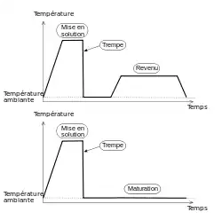 - T7 : mis en solution, trempé, sur-revenu (pour les alliages de la famille 7000).