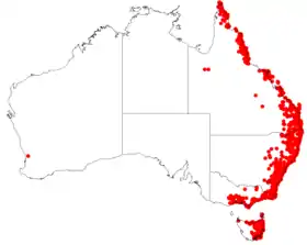 On le trouve à partir de la péninsule du cap York, au Queensland, en descendant vers le sud, le long de la côte et sur les plateaux adjacents jusqu'au Parc national Great Otway au Victoria et sur la côte est de la Tasmanie au sud de Hobart.