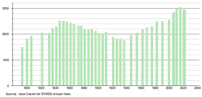 L'évolution du nombre d'habitants est connue à travers les recensements de la population effectués dans la commune depuis 1793. Pour les communes de moins de 10 000 habitants, une enquête de recensement portant sur toute la population est réalisée tous les cinq ans, les populations légales des années intermédiaires étant quant à elles estimées par interpolation ou extrapolation[46]. Pour la commune, le premier recensement exhaustif entrant dans le cadre du nouveau dispositif a été réalisé en 2005[47].