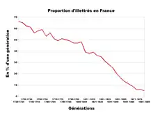 En France, l'alphabétisation concerne une large majorité de la population. Il subsiste toutefois des luttes contre l'illettrisme et analphabétisme. Dans le cadre d'une meilleure gestion et intégration des étrangers l'alphabétisation est élémentaire de nombreuses associations s'y consacre on note par exemple l'implication de la Croix Rouge qui a établi des ateliers en fonction des différentes situations afin de permettre une meilleure gestion. Il existe ainsi l’atelier d'alphabétisation. Ces cours sont assurés par des bénévoles[28].