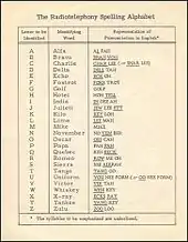 Mis au point par des techniciens de 31 nations à la suite d'études très approfondies et de centaines de milliers d'essais, un nouveau code avait été mis en application depuis le , dans l'aviation civile internationale qui avait fait enregistrer sur disque la prononciation correcte des mots. Lors des conférences de Genève en 1959, un accord a été réalisé pour l'emploi d'une table d'épellation officielle, valable dans les relations internationales[2],[3].