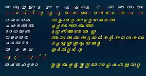 L’alphasyllabaire malayalam (malayalam : മലയാളലിപി, malayāḷalipi) est un système d’écriture brahmique principalement utilisé pour écrire le malayalam, une langue dravidienne parlée par environ 35 millions de personnes[2] notamment dans le sud de l’Inde, dans l’État du Kerala. Il est aussi utilisé pour écrire le sanskrit et le konkani conjointement avec d'autres systèmes d'écriture, ainsi que certaines langues peu parlées comme le betta kurumba et l'adiya[3]. Comme beaucoup d'autres systèmes d'écriture indiens, c'est un abugida. L'écriture s'effectue de gauche à droite et la première ligne est celle du haut tout comme dans l'alphabet latin.
