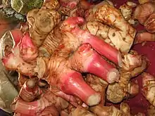 - Autres noms vulgaires (vulgarisation scientifique) : galanga de l'Inde[2], gingembre du Siam[1], gingembre siamois[1], gingembre de Chine[1] (confusion avec petit galanga[3] ?), gingembre du Laos[1], gingembre thaïlandais[1], gingembre thaï[1]