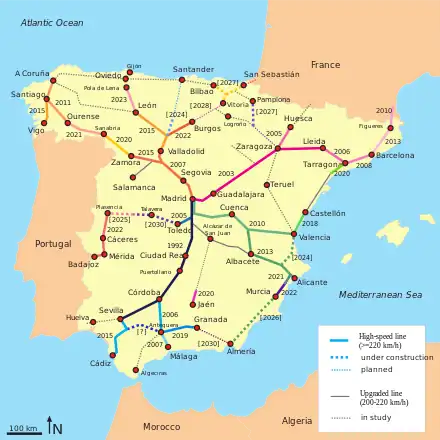 Avec ses 3 240 km en service début 2017[1], le réseau espagnol de grande vitesse est le plus étendu d'Europe et se classe deuxième à l'échelle mondiale derrière la Chine (11 132 km de LGV) et devant le Japon (2 664 km)[2] selon le dernier rapport UIC.
