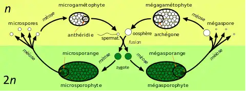 - Un zygote mâle se développe par mitose en un microsporophyte, qui produit à maturité un ou plusieurs microsporanges. Les microspores se développent à l'intérieur du microsporange par méiose
