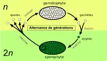 L'« alternance de générations » dans le cycle biologique est donc l'alternance entre une génération de sporophytes diploïdes (2n) et une génération de gamétophytes haploïdes (n).