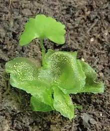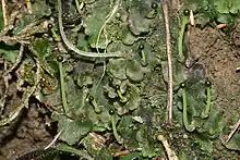 Gamétophyte de Pellia epiphylla avec sporophytes croissant à partir des vestiges d'archégones.- Anthéridies et archégones formés sur le même gamétophyte, qui est alors qualifié de « monoïque ».