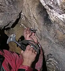 - un arbre en surface, un bloc ou un spéléothème dans la cavité, entouré d'une sangle.