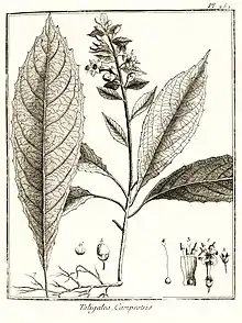 « TALIGALEA campeſtris. (Tabula 252.)Herba bi vel tri-pedalis. Radix perennis. Caules annui, ſimplices: Folia alterna, petiolata, ovata, acuta, dentata, ſubvilloſa ; infima lata, majorat ſuperiora minora ; floralia parva, ex rubro, & luteo eleganter variegata. Flores axiliares, in ſpicam diſpoſiti, ſolitarii, vel in corymbos tri-floros vel quinque-floros. Corolla lutea. Bacca nigra, ſphærica, glabra.