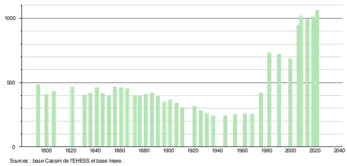 L'évolution du nombre d'habitants est connue à travers les recensements de la population effectués dans la commune depuis 1793. Pour les communes de moins de 10 000 habitants, une enquête de recensement portant sur toute la population est réalisée tous les cinq ans, les populations légales des années intermédiaires étant quant à elles estimées par interpolation ou extrapolation[23]. Pour la commune, le premier recensement exhaustif entrant dans le cadre du nouveau dispositif a été réalisé en 2008[24].