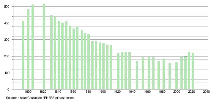 L'évolution du nombre d'habitants est connue à travers les recensements de la population effectués dans la commune depuis 1793. Pour les communes de moins de 10 000 habitants, une enquête de recensement portant sur toute la population est réalisée tous les cinq ans, les populations légales des années intermédiaires étant quant à elles estimées par interpolation ou extrapolation[25]. Pour la commune, le premier recensement exhaustif entrant dans le cadre du nouveau dispositif a été réalisé en 2006[26].