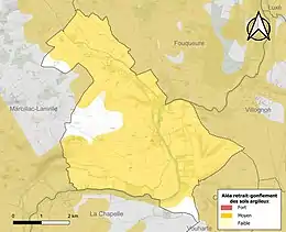 Le retrait-gonflement des sols argileux est susceptible d'engendrer des dommages importants aux bâtiments en cas d’alternance de périodes de sécheresse et de pluie. 88,7 % de la superficie communale est en aléa moyen ou fort (67,4 % au niveau départemental et 48,5 % au niveau national). Sur les 209 bâtiments dénombrés sur la commune en 2019, 209 sont en aléa moyen ou fort, soit 100 %, à comparer aux 81 % au niveau départemental et 54 % au niveau national. Une cartographie de l'exposition du territoire national au retrait gonflement des sols argileux est disponible sur le site du BRGM[21],[Carte 3].