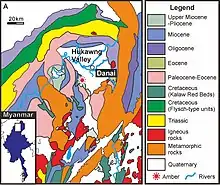 - (en) Cruickshank et Ko, « Geology of an amber locality in the Hukawng Valley, Northern Myanmar », Journal of Asian Earth Sciences, vol. 21, no 5, , p. 441–455 (DOI 10.1016/S1367-9120(02)00044-5)