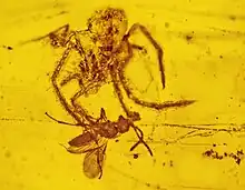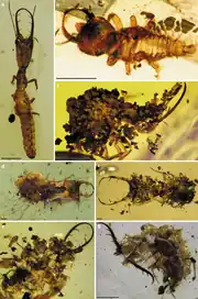 Plus de 1 000 espèces d'invertébrés sont identifiées dans le gisement, notamment les plus anciens membres de Palpigradi (Electrokoenenia)[27] et Schizomida ( Mesozomus )[28], le plus ancien ver de velours (Cretoperipatus)[29], et les seuls membres fossiles connus de Mesothelae et Ricinulei depuis le Paléozoïque. Le Chimerarachne est une araignée-tige unique possédant toujours une queue, avec des formes similaires connues uniquement du Paléozoïque.