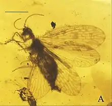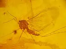 On a découvert grâce à l'ambre une espèce de l'énigmatique insecte à longues pattes Chresmoda[30]. Tout comme le mésophthirus, un parasite de type poux[31].