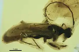 Vue de dos du spécimen holotype MNHN A30088 Gerontoformica cretacica dans l'ambre charentais datant d'environ 100 Ma | |||||