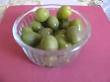 - Fruit : l'olive a une forme ovoïde, légèrement asymétrique, sa base est tronquée et son sommet arrondi. Il porte de grandes lenticelles. Les fruits sont isolés ou parfois groupés par deux.