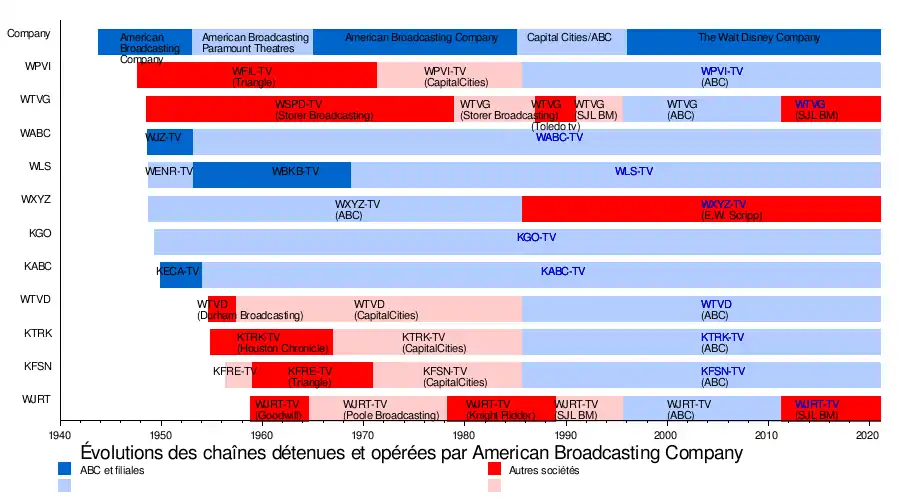 Le réseau est créé le comme un réseau radiophonique, successeur de NBC Blue racheté par Edward Noble, puis s'étend à télévision à partir de 1948. Au milieu des années 1950, le groupe fusionne avec United Paramount Theatres, l'ancienne division d'exploitation de salles de cinéma de Paramount Pictures dirigée par Leonard Goldenson. Ce dernier parvient à rendre la chaîne de télévision rentable avec de nombreuses séries télévisées à succès. Dans les années 1970, après avoir revendu ses salles de cinéma, ABC fusionne avec le groupe de presse Capital Cities. Au début des années 1980, la société ABC prend le contrôle de la nouvelle chaîne sportive ESPN avec 80 % du capital. Depuis 1996, la chaîne ABC fait partie du Disney-ABC Television Group, une division de la Walt Disney Company. En 2001, Disney rachète à la Fox une chaîne de télévision par câble spécialisée dans la rediffusion de séries et la renomme ABC Family (rebaptisée Freeform en 2016).