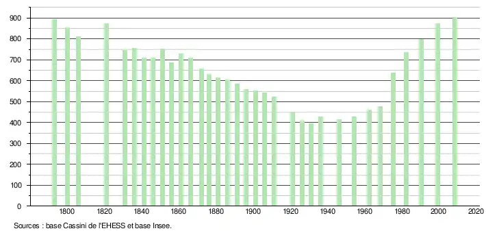 L'évolution du nombre d'habitants est connue à travers les recensements de la population effectués dans la commune depuis 1793. À partir du , les populations légales des communes sont publiées annuellement dans le cadre d'un recensement qui repose désormais sur une collecte d'information annuelle, concernant successivement tous les territoires communaux au cours d'une période de cinq ans. Pour les communes de moins de 10 000 habitants, une enquête de recensement portant sur toute la population est réalisée tous les cinq ans, les populations légales des années intermédiaires étant quant à elles estimées par interpolation ou extrapolation[7]. Pour la commune, le premier recensement exhaustif entrant dans le cadre du nouveau dispositif a été réalisé en 2008[8],[Note 1].