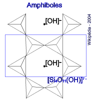 Les amphiboles sont caractérisées par l'anion [Si4O11(OH)]7 - et en particulier par la présence d'eau. En effet ce sont des minéraux hydratés contrairement aux pyroxènes. On peut distinguer macroscopiquement les amphiboles grâce à leurs clivages à 120°, contrairement aux pyroxènes qui ont un clivage à 90°.