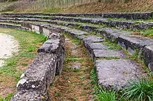 Les spectateurs prennent place sur des gradins, en pierre pour les rangs les plus proches de l'arène — ils sont partiellement conservés — et plus probablement en bois pour les autres gradins, jusqu'en haut de la cavea[8].