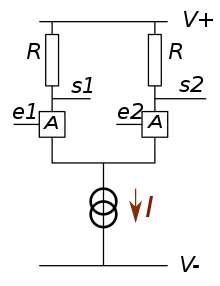 La structure de base d'un amplificateur différentiel comporte deux composants actifs identiques, dont la partie commune à l'entrée et la sortie est reliée à un élément à courant constant. Si le courant qui traverse une des branches augmente, l'autre doit nécessairement diminuer. La sortie se trouve ainsi différentielle, et, par répercussion, l'entrée.