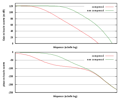 Chaque étage d'un amplificateur possède une résistance de sortie et une capacité en entrée. Ainsi, chaque étage d'un amplificateur se comporte comme un filtre passe-bas du premier ordre pour son prédécesseur. C'est ce qui explique les variations de gain et de phase en fonction de la fréquence dans un AOP. Les AOP étant généralement composés d'au moins trois étages d'amplification[47], ils se comportent en boucle ouverte comme un filtre passe-bas du troisième ordre. Or, dans un AOP le gain continu est tel que l'amplificateur possède encore un gain en boucle ouverte supérieur à 1 lorsque le déphasage vaut 180°, ce qui peut poser des problèmes de stabilité lors d'une utilisation en boucle fermée.