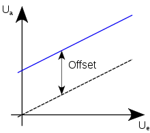 Lorsqu'un amplificateur opérationnel ne reçoit aucun signal sur ses entrées (lorsque ses entrées sont toutes les deux réunies à zéro), il subsiste généralement une tension continue de décalage de la tension de sortie vis-à-vis de zéro. Ce décalage (ou offset) provient de deux phénomènes : la tension de décalage propre aux circuits internes de l'AOP d'une part, et l'influence des courants de polarisation[30] de la paire différentielle des transistors d'entrée sur le circuit extérieur d'autre part.