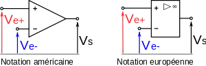 La broche d'alimentation positive repérée est parfois aussi appelée , , ou VS+. La broche d'alimentation négative repérée est parfois aussi appelée , , ou VS−. Le caractère doublé qui se trouve en indice de la lettre V fait référence au nom de la broche du transistor à laquelle cette alimentation sera généralement reliée[20]. Ainsi, les appellations et sont généralement réservées aux AOP bipolaires (C pour Collecteur et E pour Émetteur) tandis que les appellations et sont généralement réservées aux AOP à effet de champ (D pour Drain et S pour Source).
