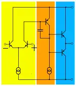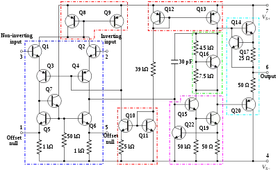 Les AOP sont généralement constitués d'au moins trois étages : un étage différentiel (en jaune sur la figure), un ou plusieurs étages d'amplification de la tension (en orange) et un buffer de tension (en bleu)[47]. L'étage différentiel d'entrée est généralement constitué d'une paire différentielle. Il fournit l'amplification différentielle entre les deux entrées ainsi que la haute impédance d'entrée. L'étage différentiel peut comporter un système de compensation des courants de polarisation. Dans ce cas, la base de chaque transistor d'entrée est reliée au collecteur d'un transistor qui fournit alors le courant nécessaire à la polarisation de la paire différentielle d'entrée. L'étage d'amplification est généralement un amplificateur de fort gain et de classe A. La capacité présente dans l'étage d'amplification de tension permet d'effectuer la compensation fréquentielle. Le buffer de tension qui sert d'étage de sortie, possède un gain en tension de un. Il permet à l'amplificateur de fournir des courants importants en sortie avec une faible impédance de sortie. Il inclut aussi les limitations de courant ainsi que les protections contre les courts-circuits.